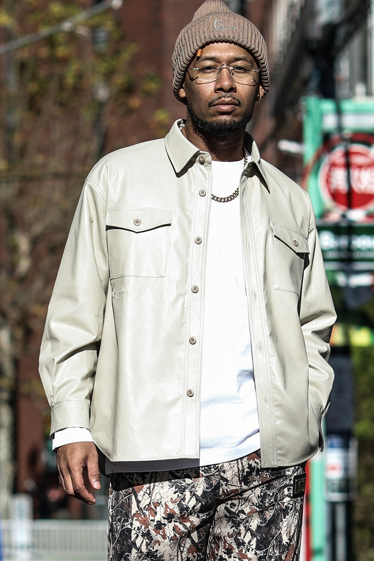 トップスはシンプルにまとめつつボトムスには柄パンツをセレクトして、スタイル全体に遊び心をプラス。薄めのベージュだからこそ派手な柄も自然に引き立つ、メリハリのあるストリートスタイルに。