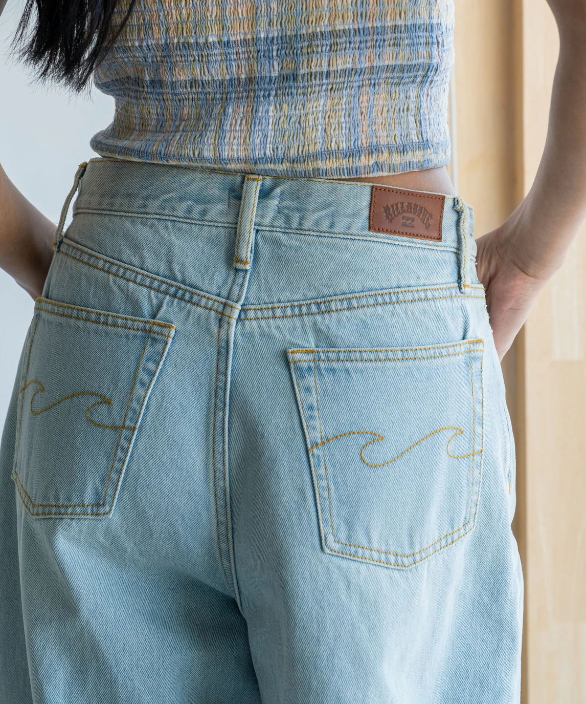 デニム生地を使用。BILLABONGらしいバックポケットのWAVEステッチ、クラッシュダメージ加工がポイント。