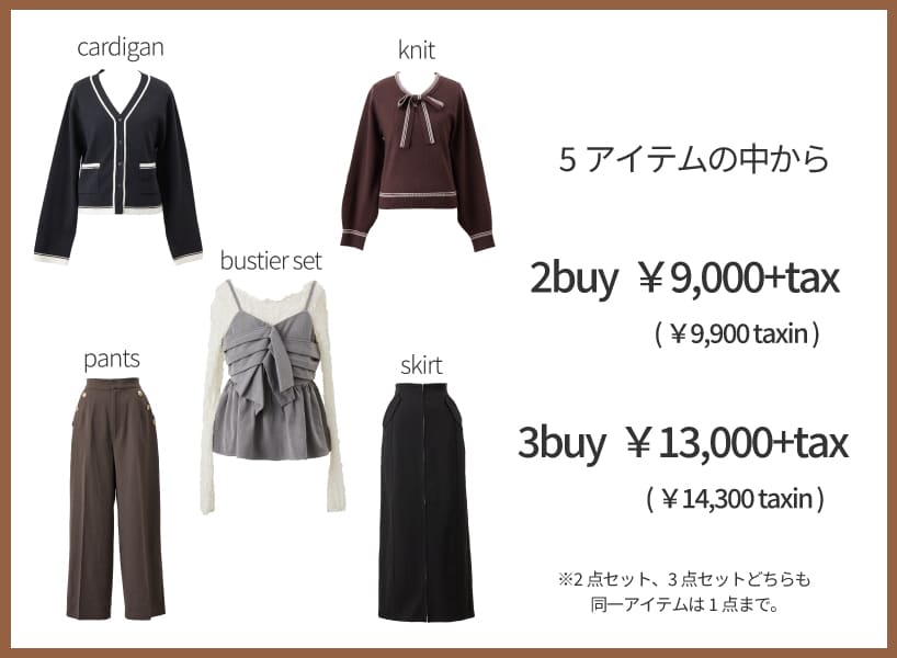 5品番の中からお好きな商品2点¥9,900(税込)、3点¥14,300(税込)!