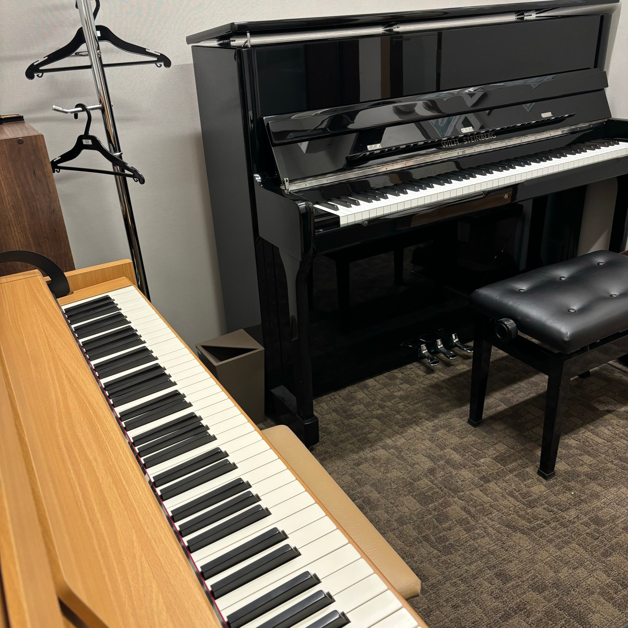 アップライトピアノ1台と電子ピアノ1台のお部屋です。レッスンにお通いいただくと無料で1日1回30分無料でレンタルできます♪