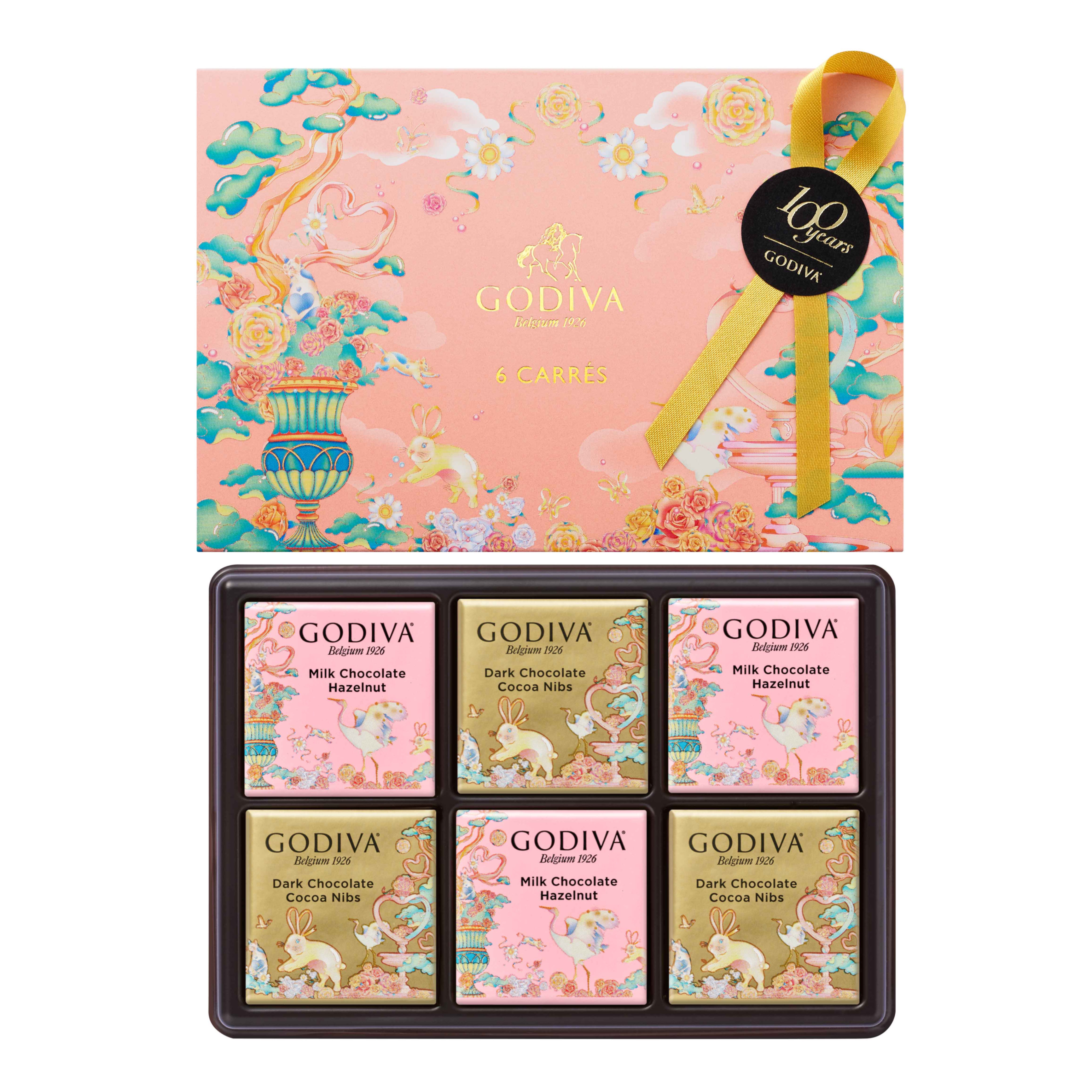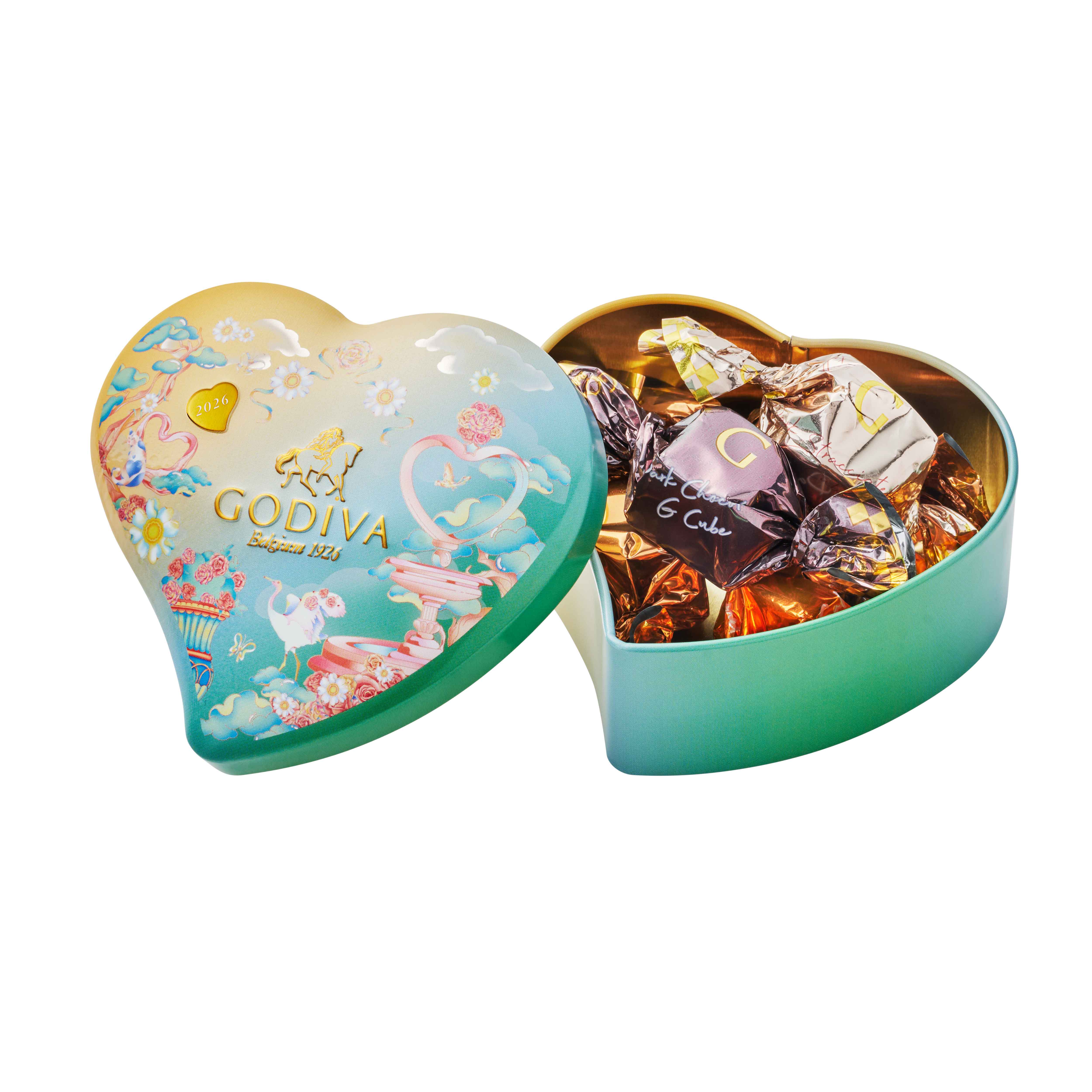 やわらかなグラデーションの空を背景に、優雅に咲き誇るバラの花々や舞う小鳥たちやうさぎなど、幻想的なデザインのハート形の缶に、ミルク ブロンドソルテッドキャラメル、ミルク、ダーク、2026年バレンタインより新登場のストラッチアテーラのG キューブ チョコレートを詰め合わせました。