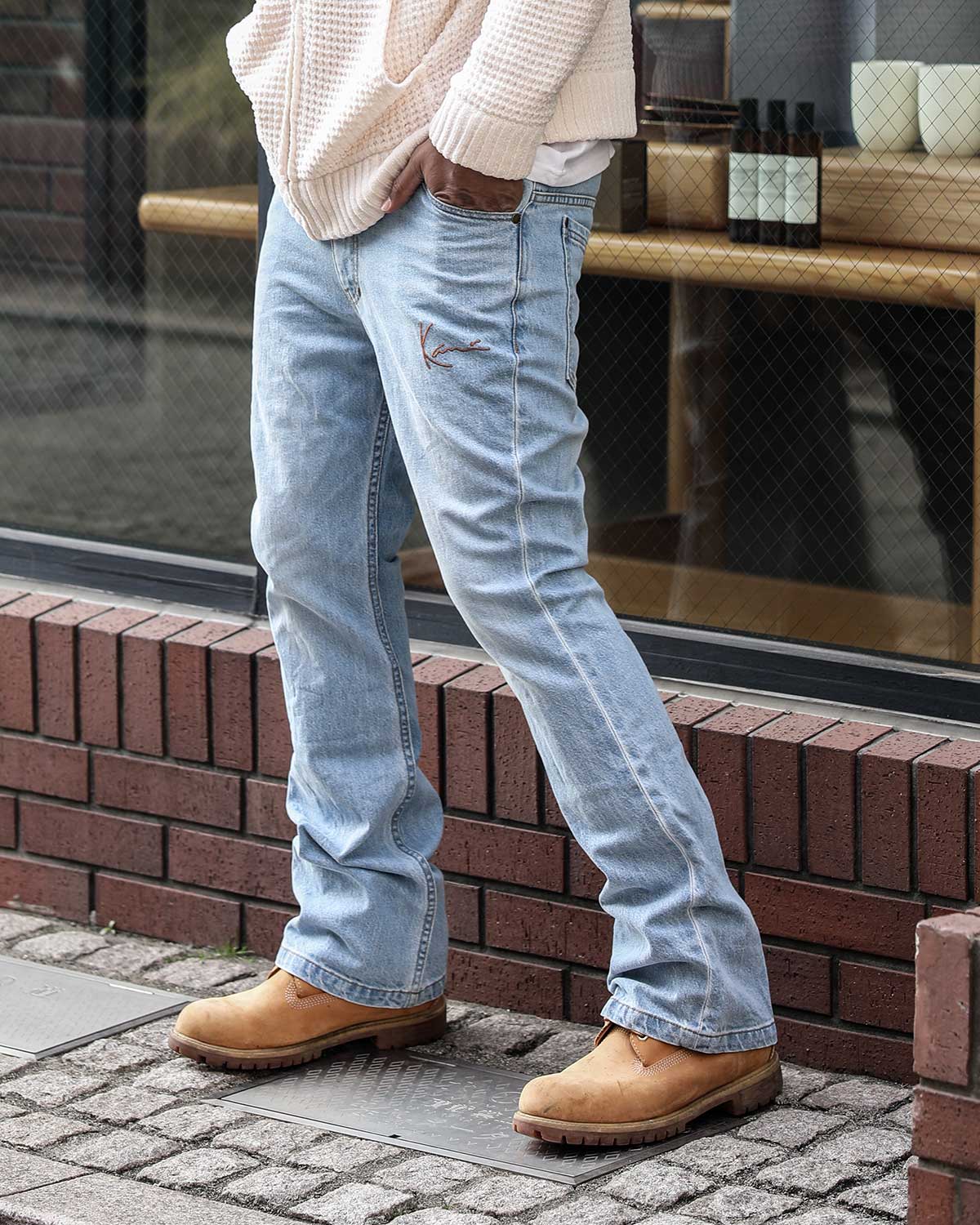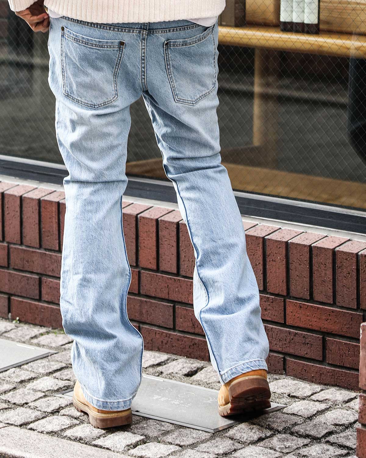 また、ブーツと合わせやすいように設計されているため、裾の広がりによりボリュームのあるブーツをスマートに包み込み、抜群のバランスを生みだす。