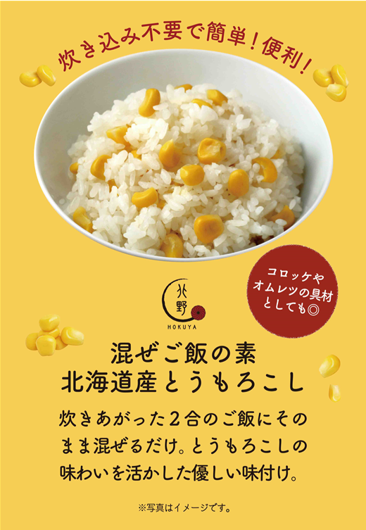 北海道産のとうもろこしを使用した、これからの季節に食べたい混ぜご飯の素です。