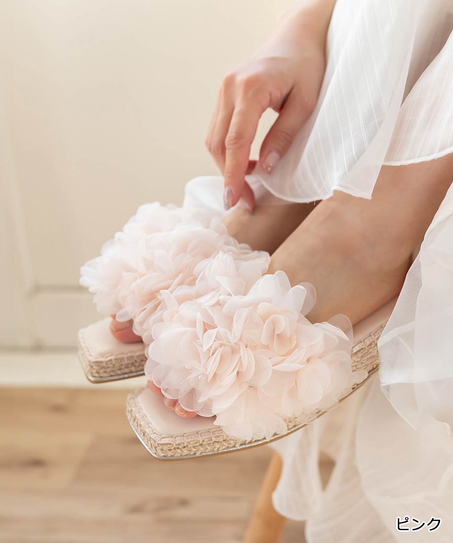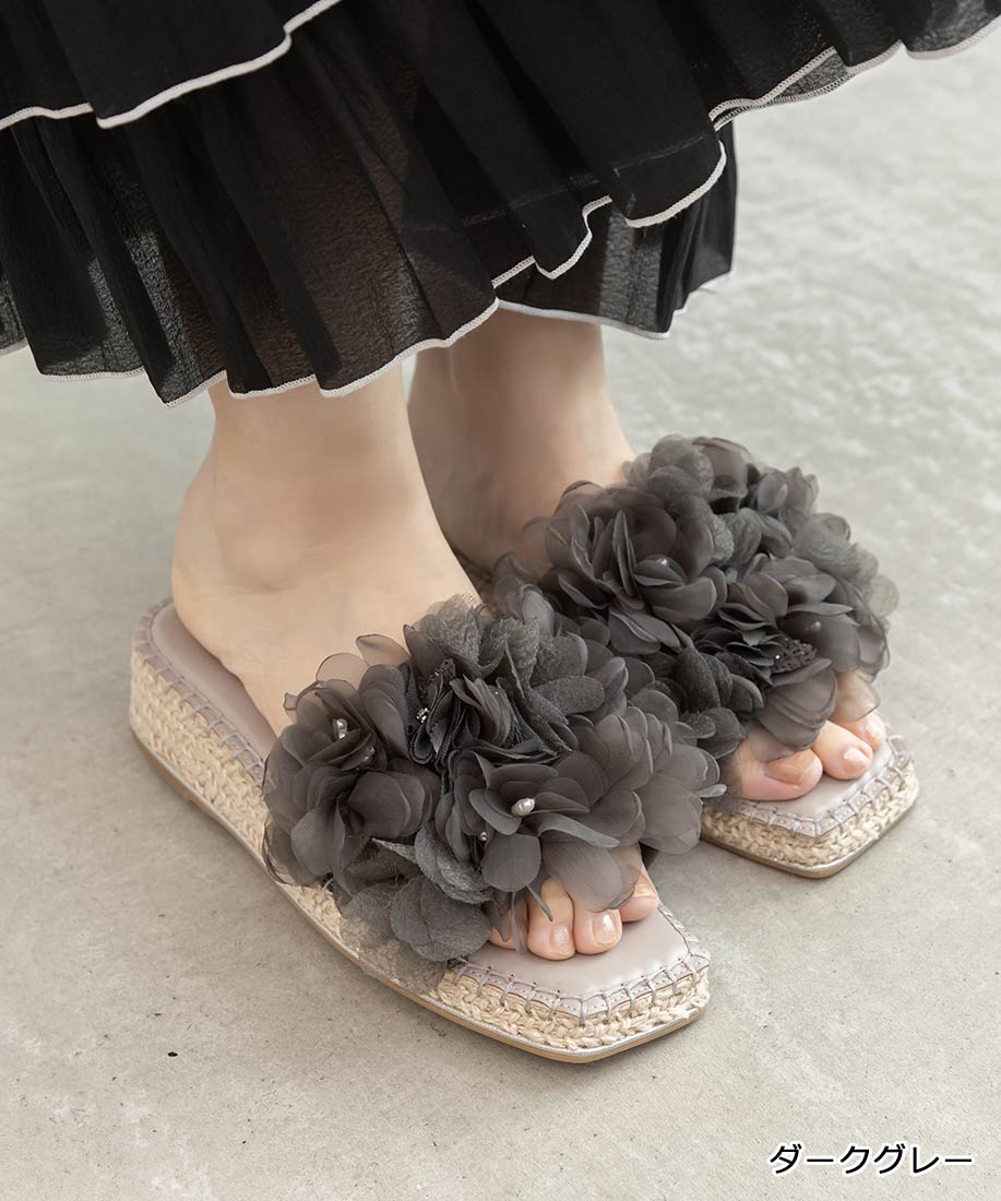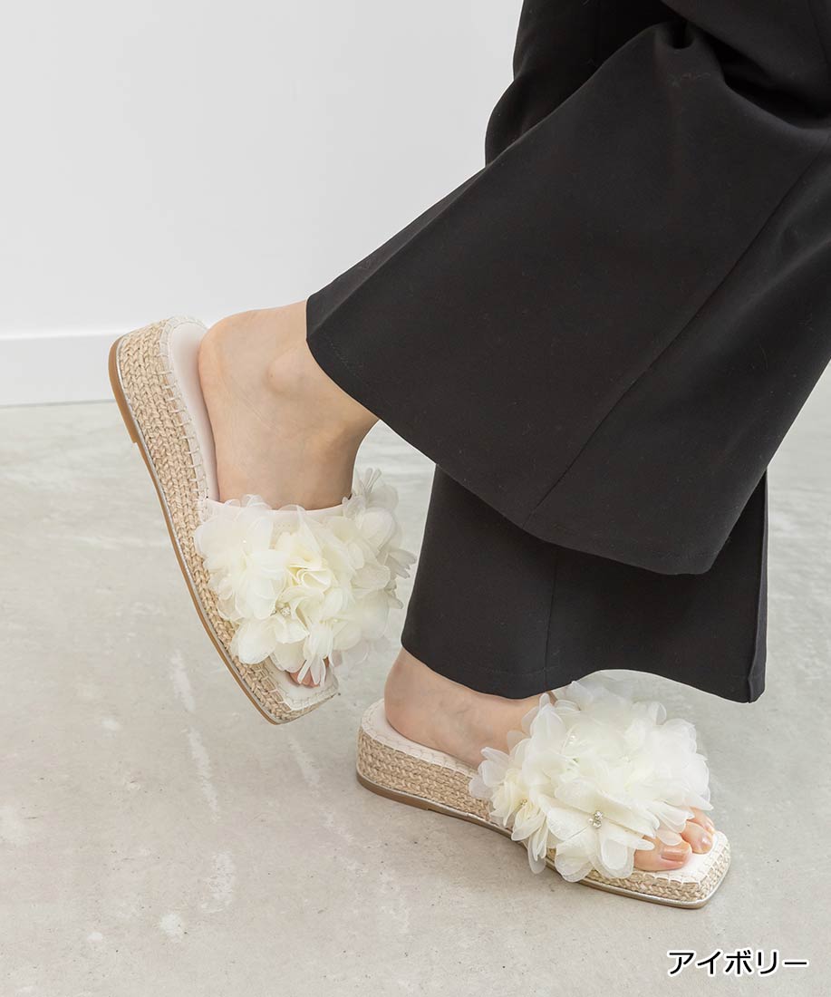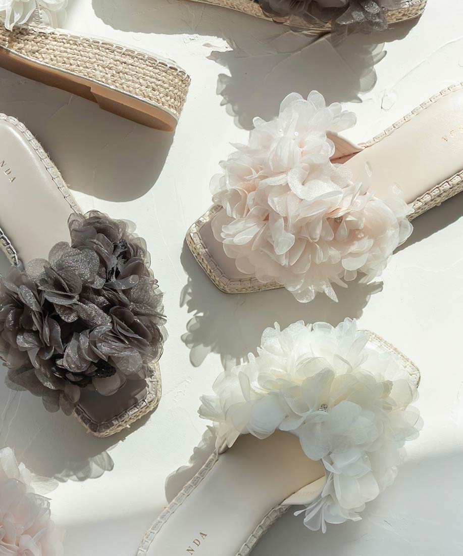 エアリーなフラワーモチーフが大人可愛いミュールサンダル。