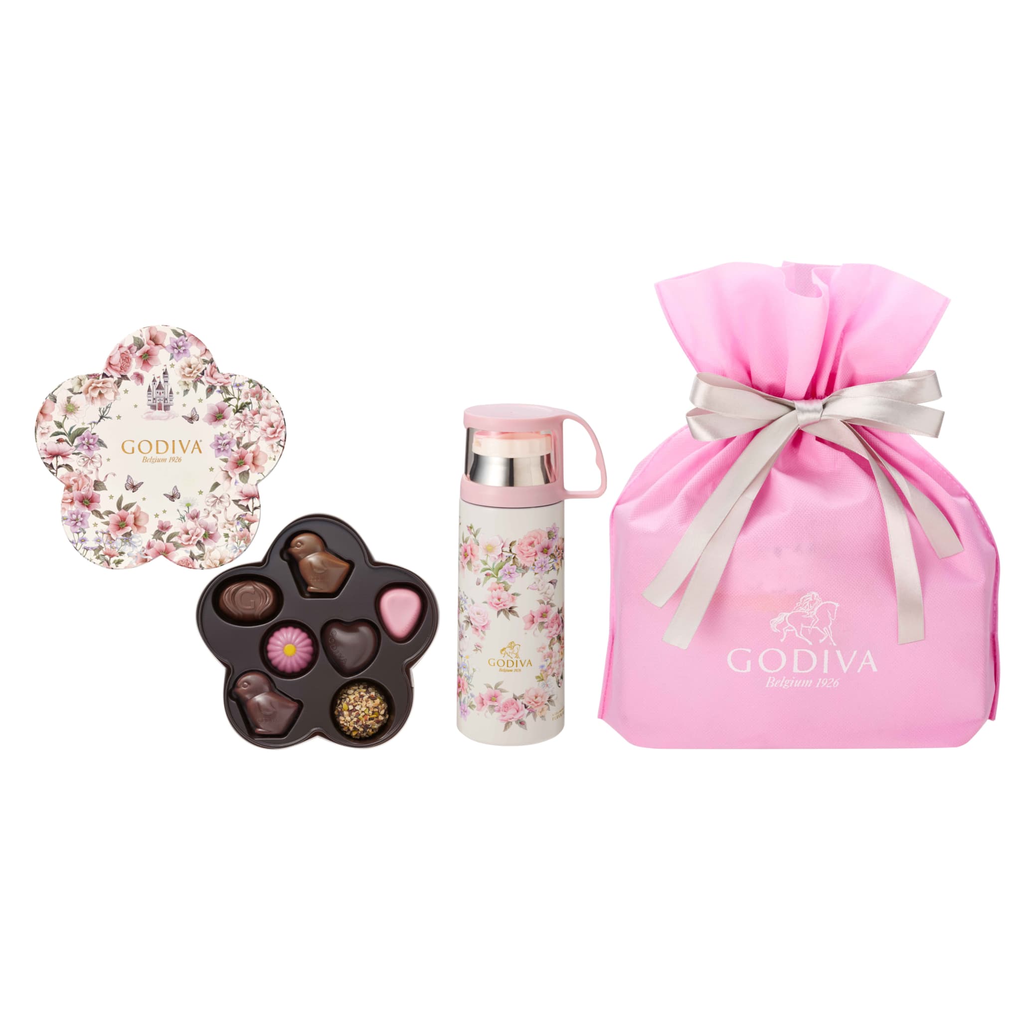 ​春らしい色とりどりの花を表現したフラワー形のパッケージの心躍るチョコレートの詰め合わせと、オリジナルデザインのステンレスボトルをセットにしました。母の日の贈り物にもおすすめです。