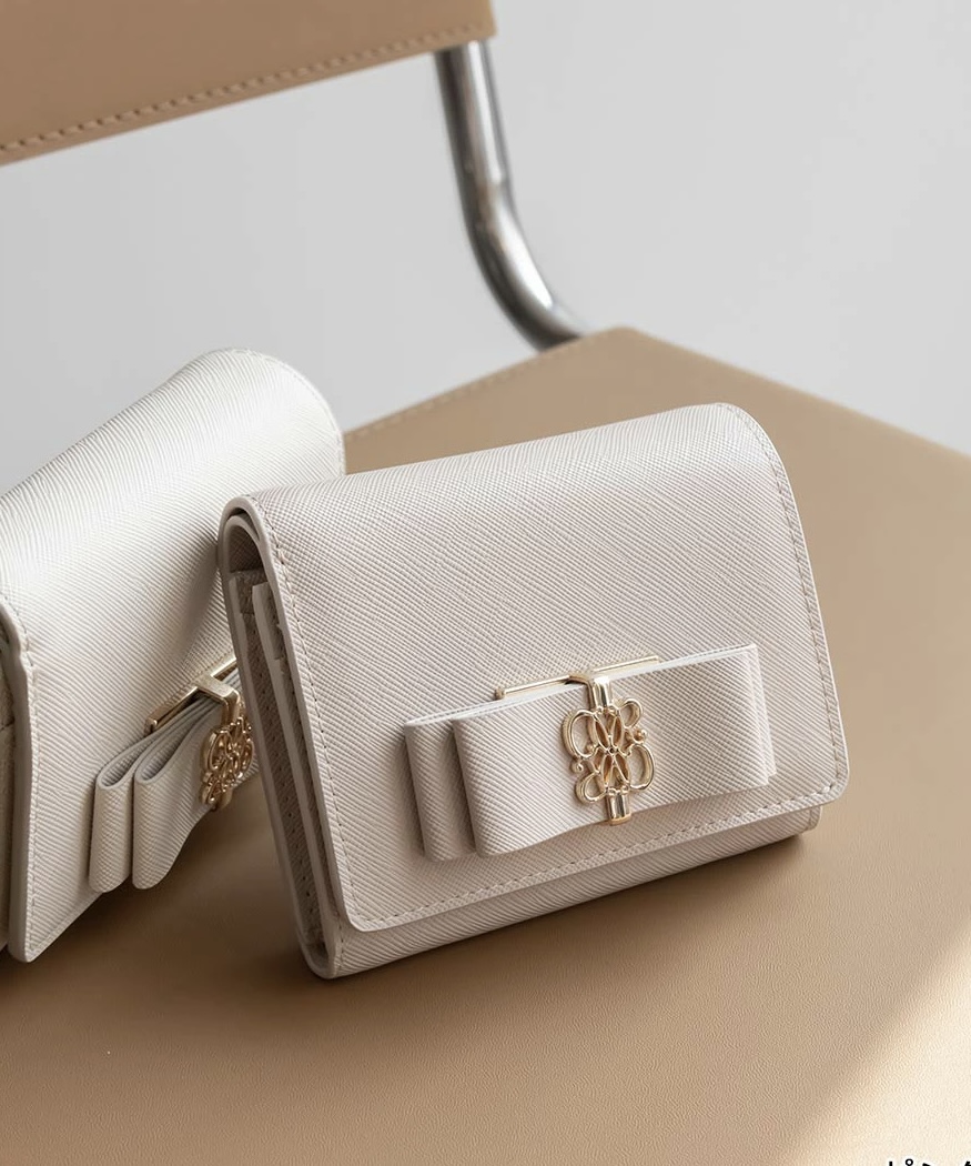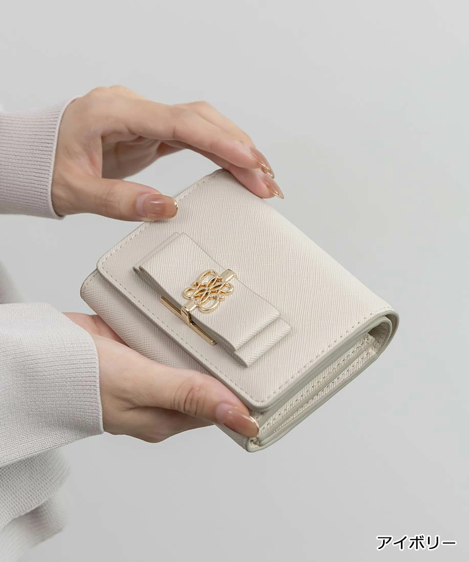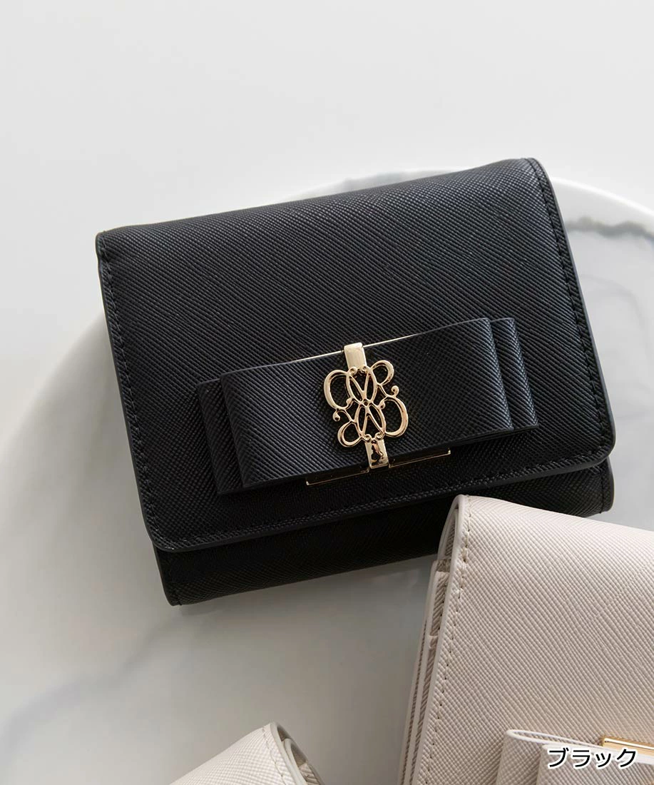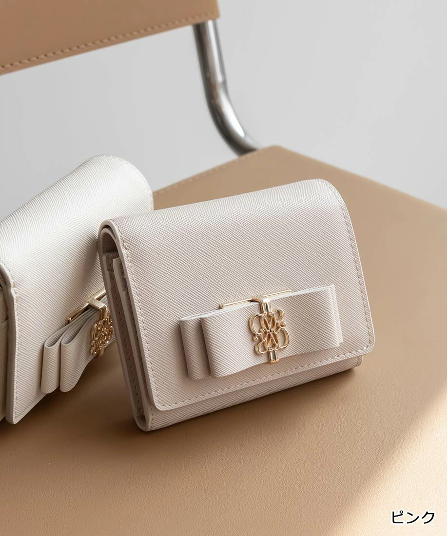 上品なフロントのダブルリボンが目を惹く二つ折りウォレット。