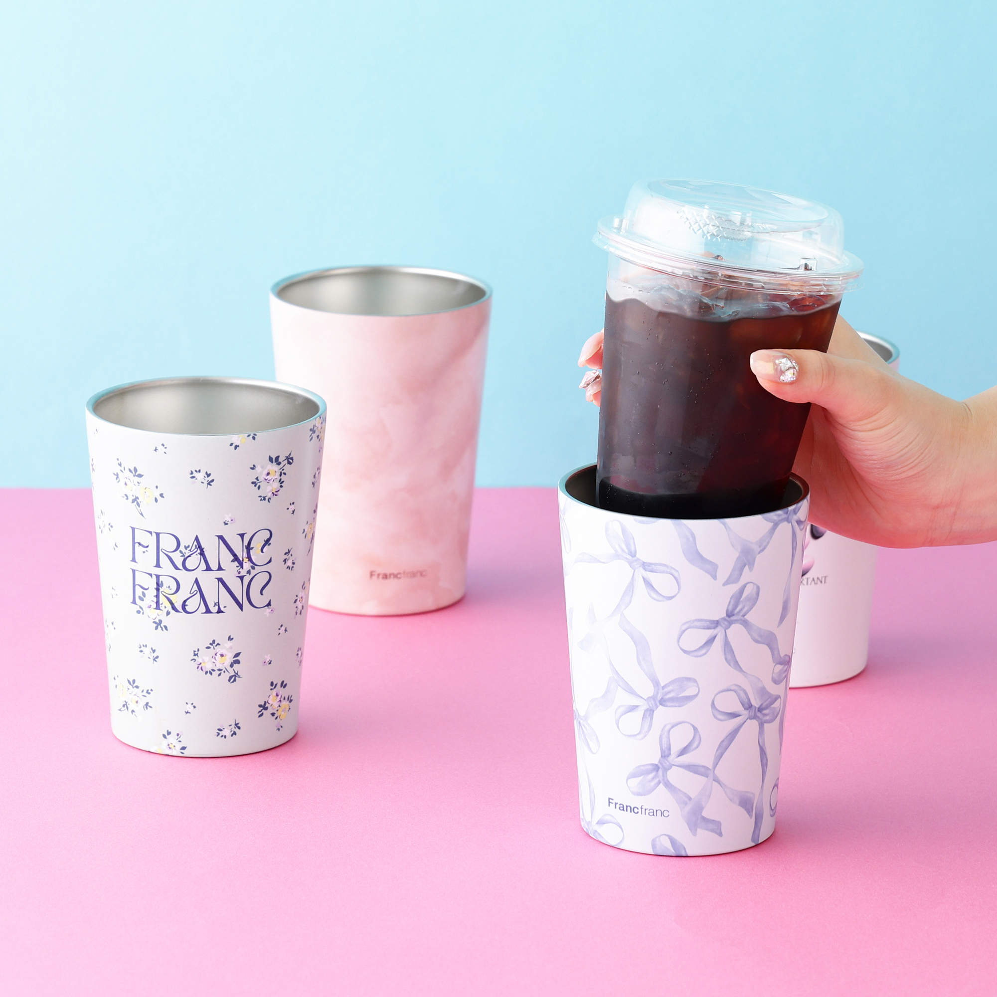 テイクアウトしたドリンクをカップごと入れて、冷たいままキープしてくれるステンレスのタンブラーです♪