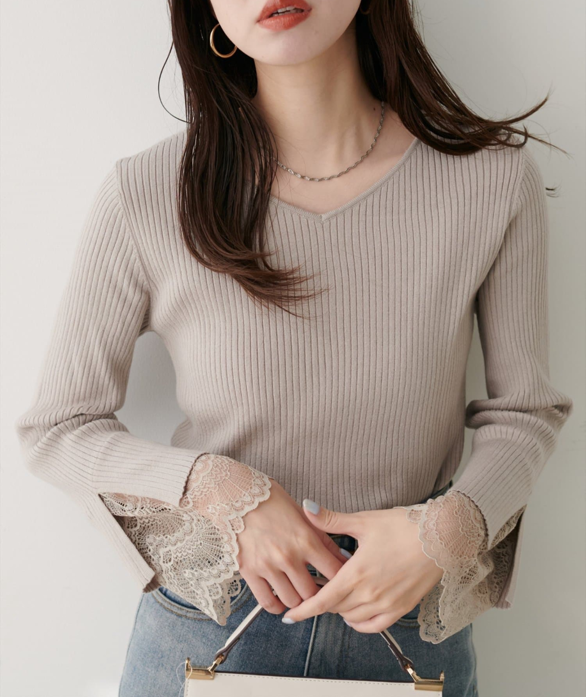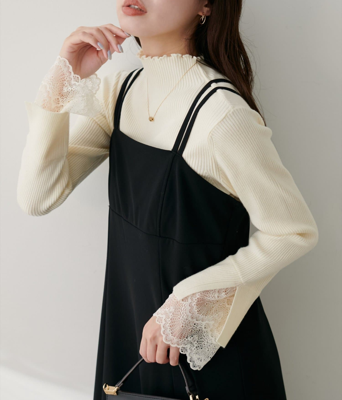 コーディネートを選ばないシンプルなリブニットに袖口のレース。切替がフェミニンなハイネックニット。