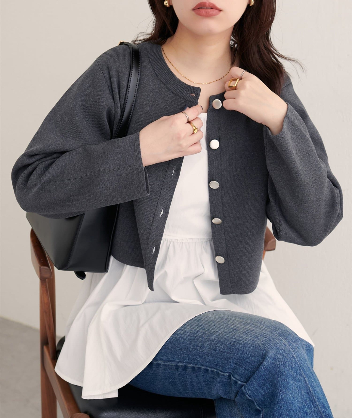 コンパクトなシルエットなので、ワンピースやブラウスの上にも織りやすく、レイヤードスタイルにも重宝します。
