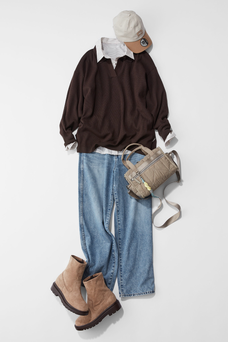 ニットとシャツの組み合わせでお洒落度アップ♪