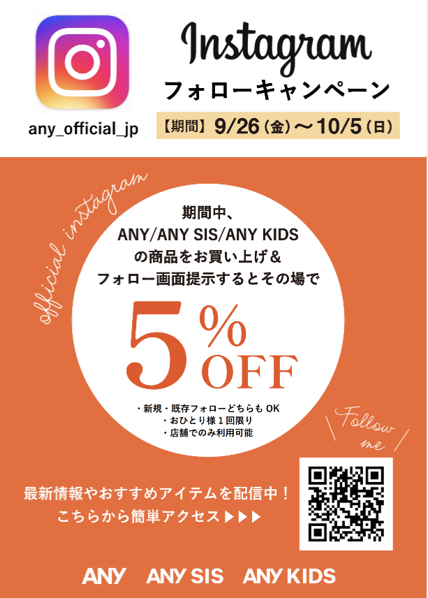 【ANY】【ANY SIS】【ANY キッズ】の商品をお買い上げの際に公式Instagramのフォロー画面ご提示で、5%OFFいたします。