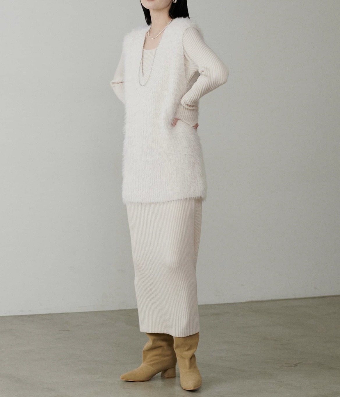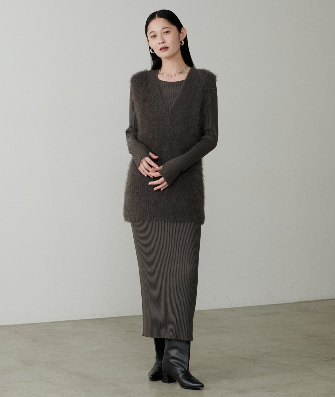 シンプルなリブのニットワンピースに同色のフェザーベストがセットになったアイテム。