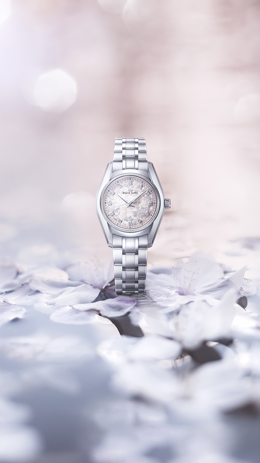 「62GS」の中でも高い支持を得ている「花筏(はないかだ)」に、26mmスモールサイズのクオーツモデルが加わりました。1967年発売のグランドセイコー史上初の自動巻機械式モデル「62GS」を現代的にアレンジした「62GS現代デザインモデル」をベースとし、日本特有の季節の移ろいをダイヤルで表現したモデルです。ベゼル(ガラス縁)のない構造によって広々と見えるダイヤルや、ザラツ研磨によって実現したシャープな多面体からなるケースが魅力です。ダイヤルは、風に舞い散った桜の花びらが川の水面を覆う「花筏」の情景を表現しています。ケースデザインは、小さいながらも高い視認性を確保。シンメトリーに配したダイヤモンドが生み出す、華やかで心地よいダイヤルに仕上げました。ムーブメントは、年差±10秒のクオーツ「キャリバー4J51」を採用しています。