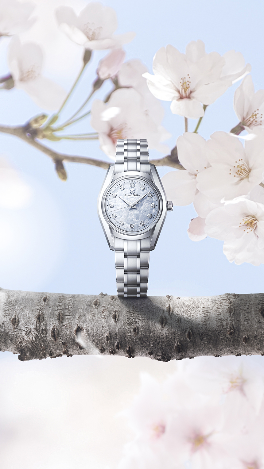 桜とともに光り輝く春の柔らかな風を表現した季語「風光る」をイメージしたスモールサイズのクオーツモデル。1967年発売のグランドセイコー史上初の自動巻機械式モデル「62GS」を現代的にアレンジした「62GS現代デザインモデル」をベースとし、日本特有の季節の移ろいをダイヤルで表現したモデルです。ベゼル(ガラス縁)のない構造によって広々と見えるダイヤルや、ザラツ研磨によって実現したシャープな多面体からなるケースが魅力です。ダイヤルは、桜の咲き渡る春の陽光の中を、爽やかな風が花びらを揺らし、きらめきながら吹きわたる情景を表現。ムーブメントは、年差±10秒のクオーツ「キャリバー4J51」を採用しました。
