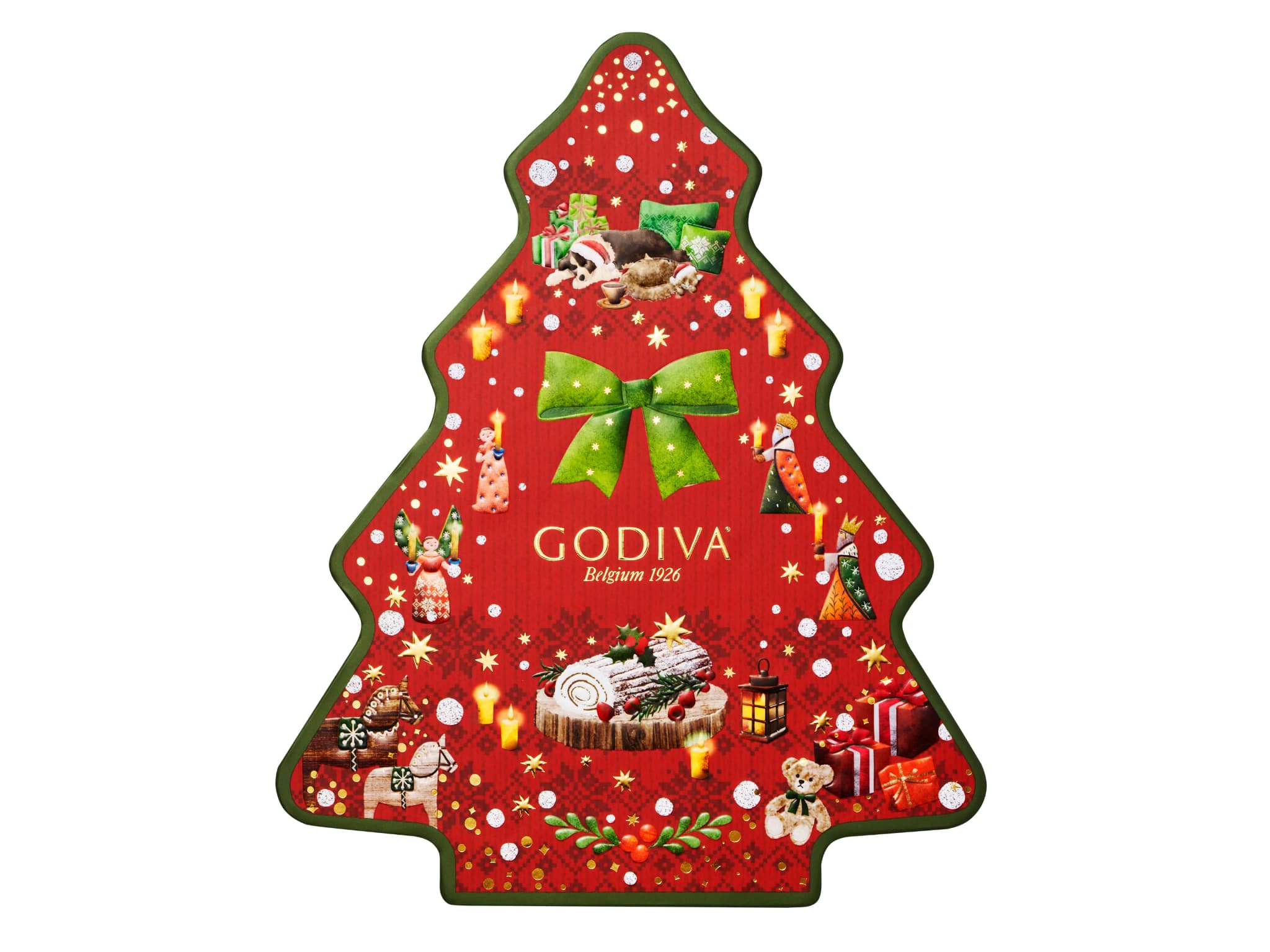 ゴディバの2025年ホリデーコレクションは、シェフによって生み出される、美しく洗練されたさまざまなブッシュ ド ノエルをチョコレートで表現しました。 雪が舞い降る聖夜、クリスマスを祝う温かなひととき。ホリデーシーズンを彩るブッシュ ド ノエルやお部屋で寛ぐペットたち、美しくラッピングされたギフトボックスなどを描いた、赤いツリー形のパッケージに、ブッシュ ド ノエルを表現した限定チョコレートなどを詰め合わせました。