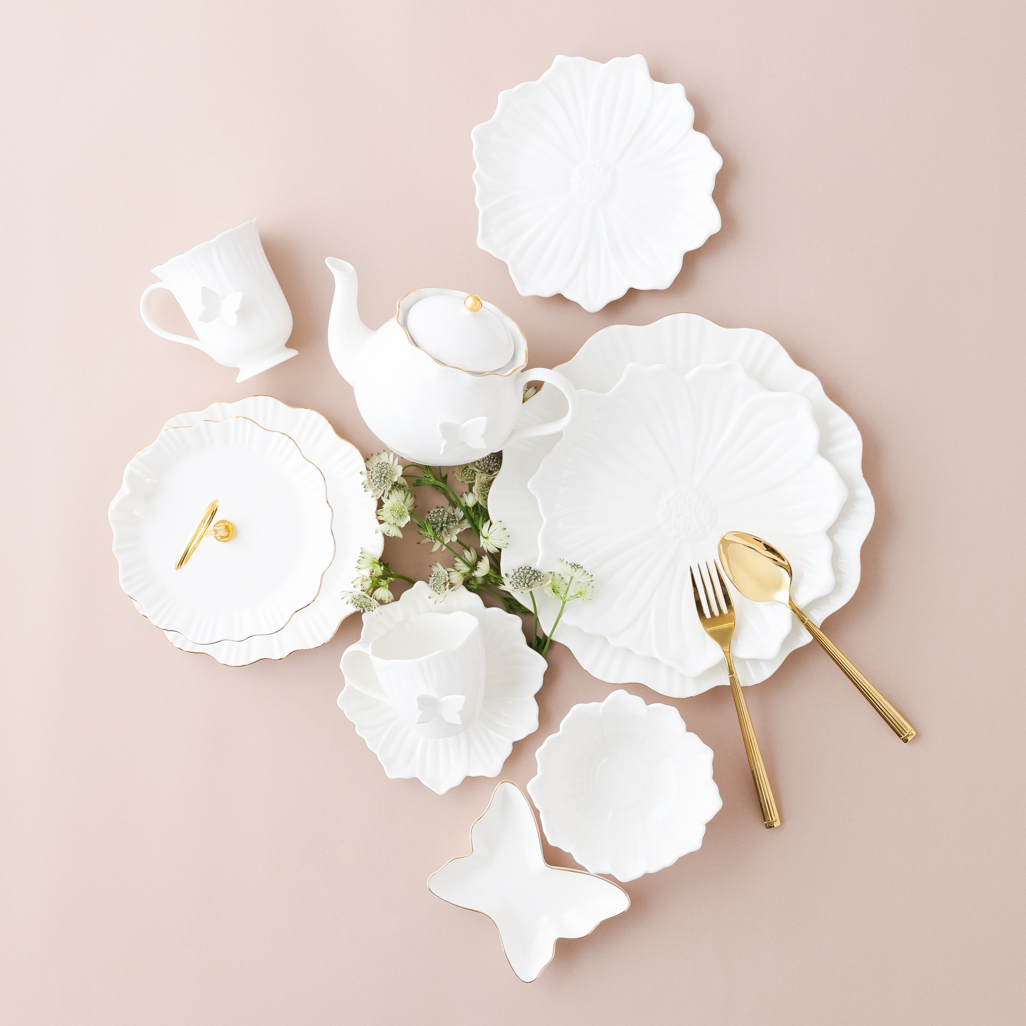 ワントーン配色でまとめているためコーディネートしやすく、ライン使いで揃えることで、より華やかで統一感のあるティータイムを演出します。