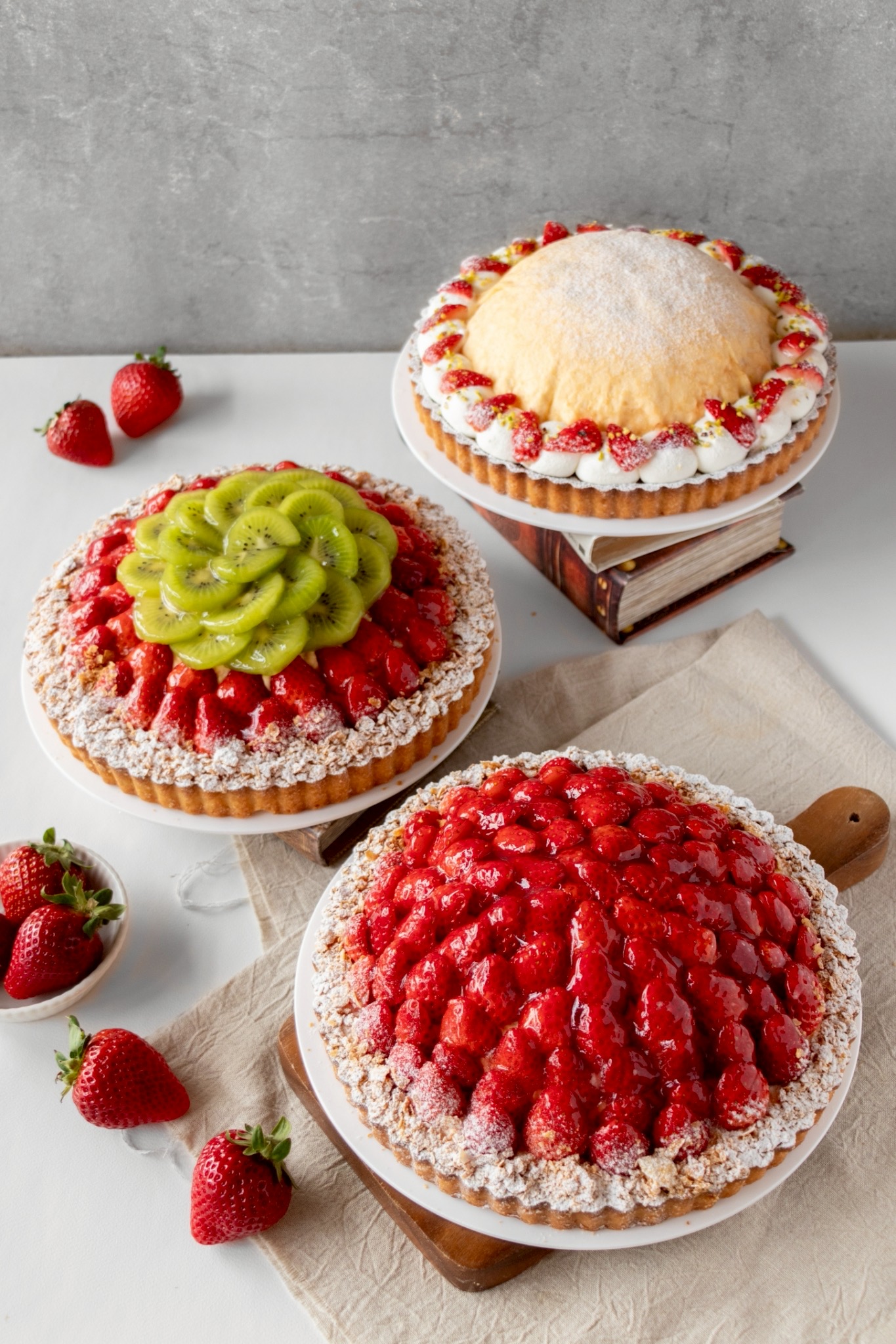 定番のいちごのタルトをはじめ、国産キウイやパイナップルなどの果実を組み合わせたタルト、何層にも重ねたクレープ生地といちごの味わいを楽しめるタルトなど、