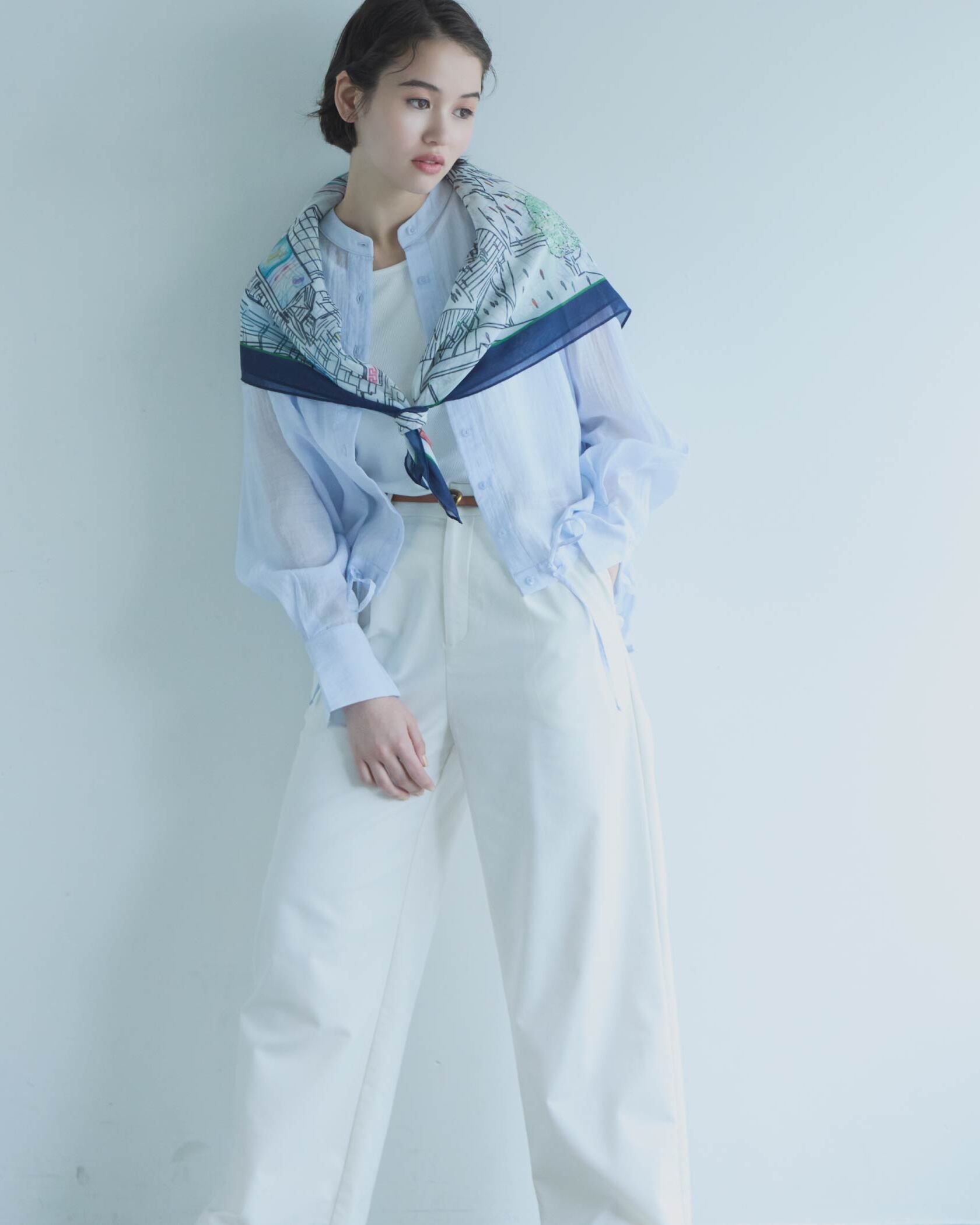 顔回りがすっきり見えるバンドカラー、袖と後身頃にはタックを入れて