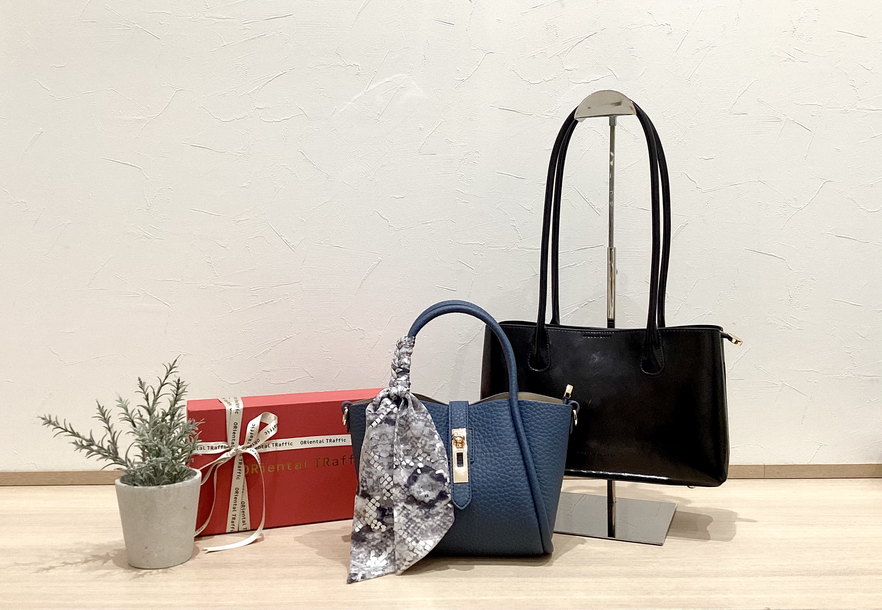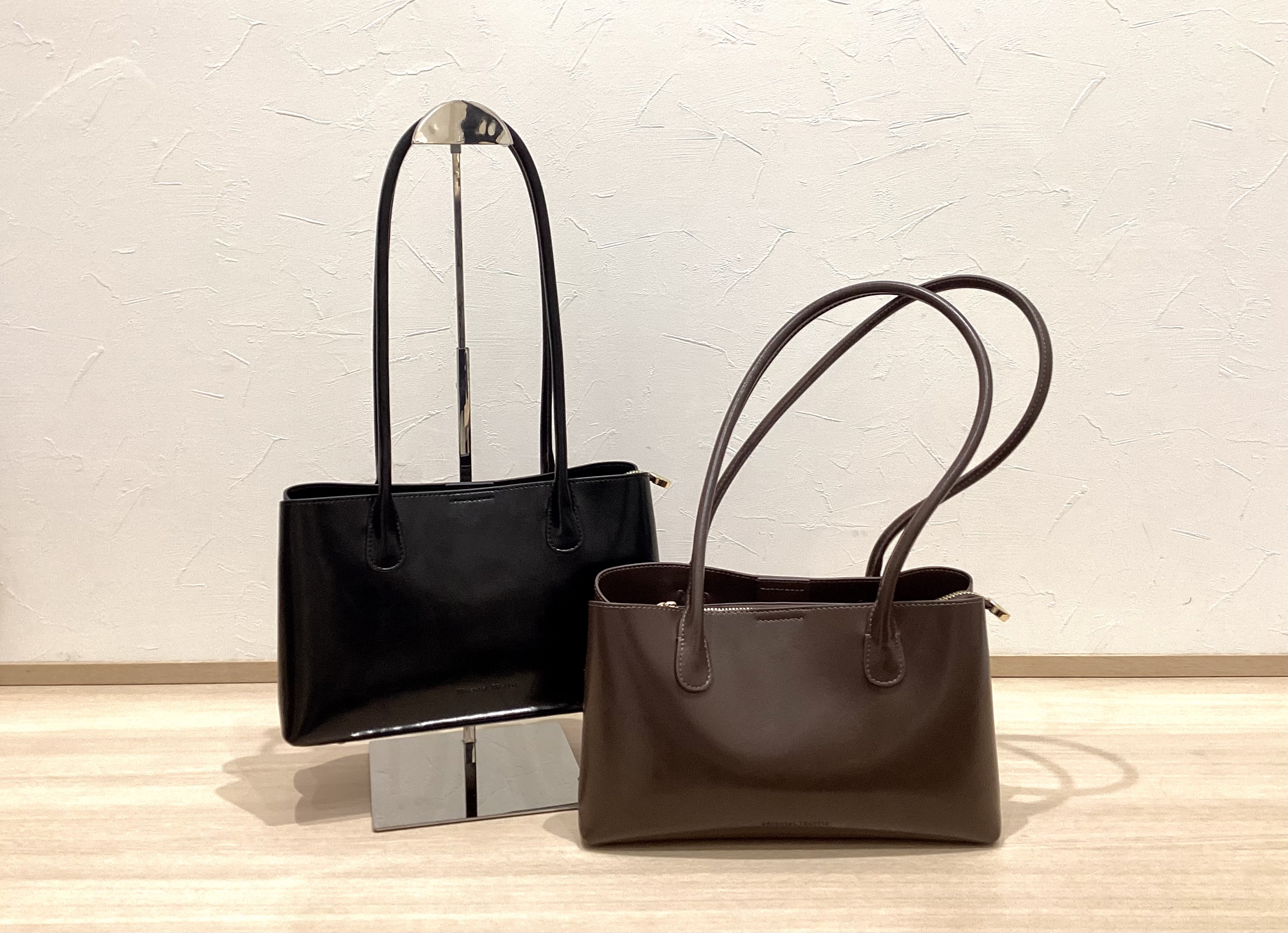 旬のロングハンドルデザインのバッグはアウターの上からでも肩掛けしやすいのがポイント。