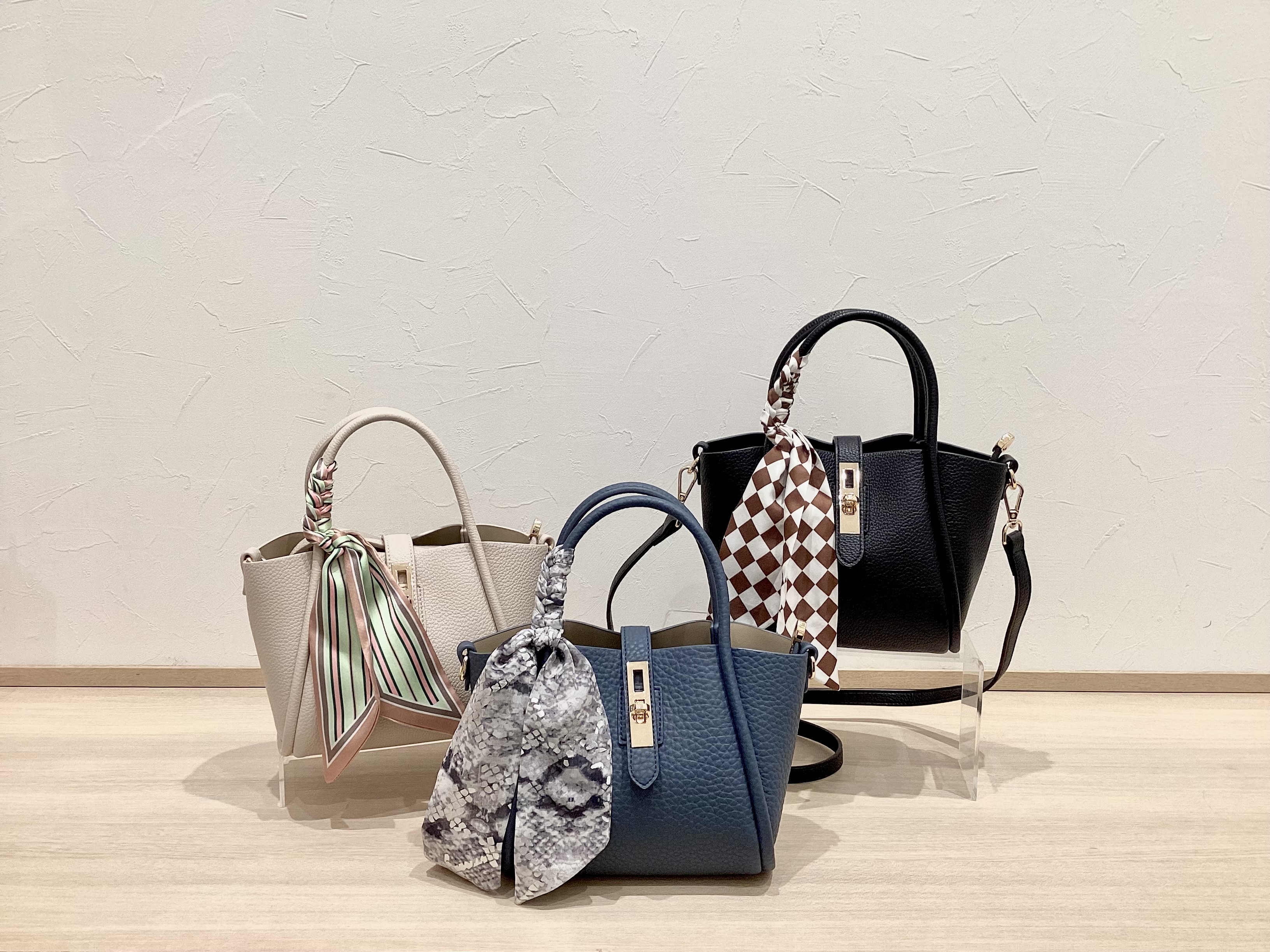 ブラックにはブロック柄、ベージュにはストライプ、ブルーにはニュアンスのあるアニマル柄とカラー毎にスカーフを変えたこだわりの詰まったバッグです。