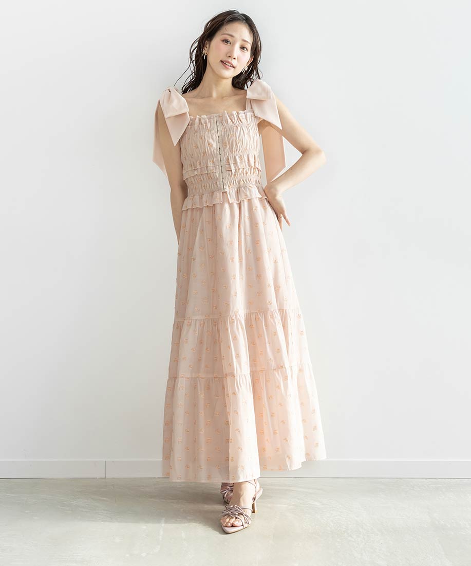 大胆なショルダーリボンと美しいシルエットが魅力のワンピース。