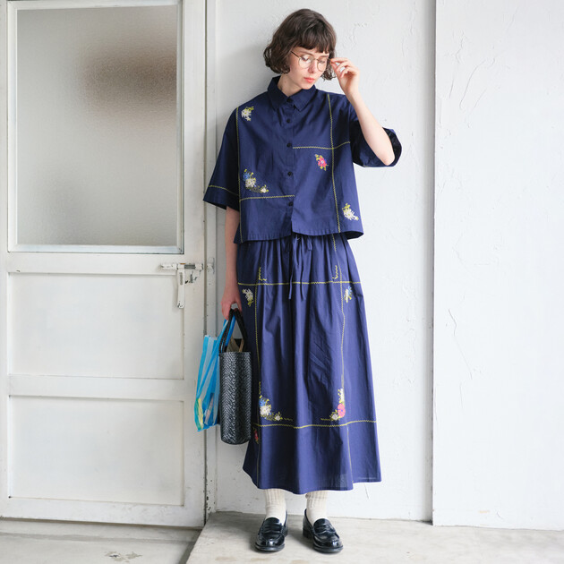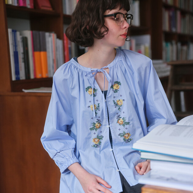サジュ—の刺繍アーカイブの図案をクロスステッチ風刺繍であしらったブラウス。涼しげでさわやかなブルーは初夏にぴったり。