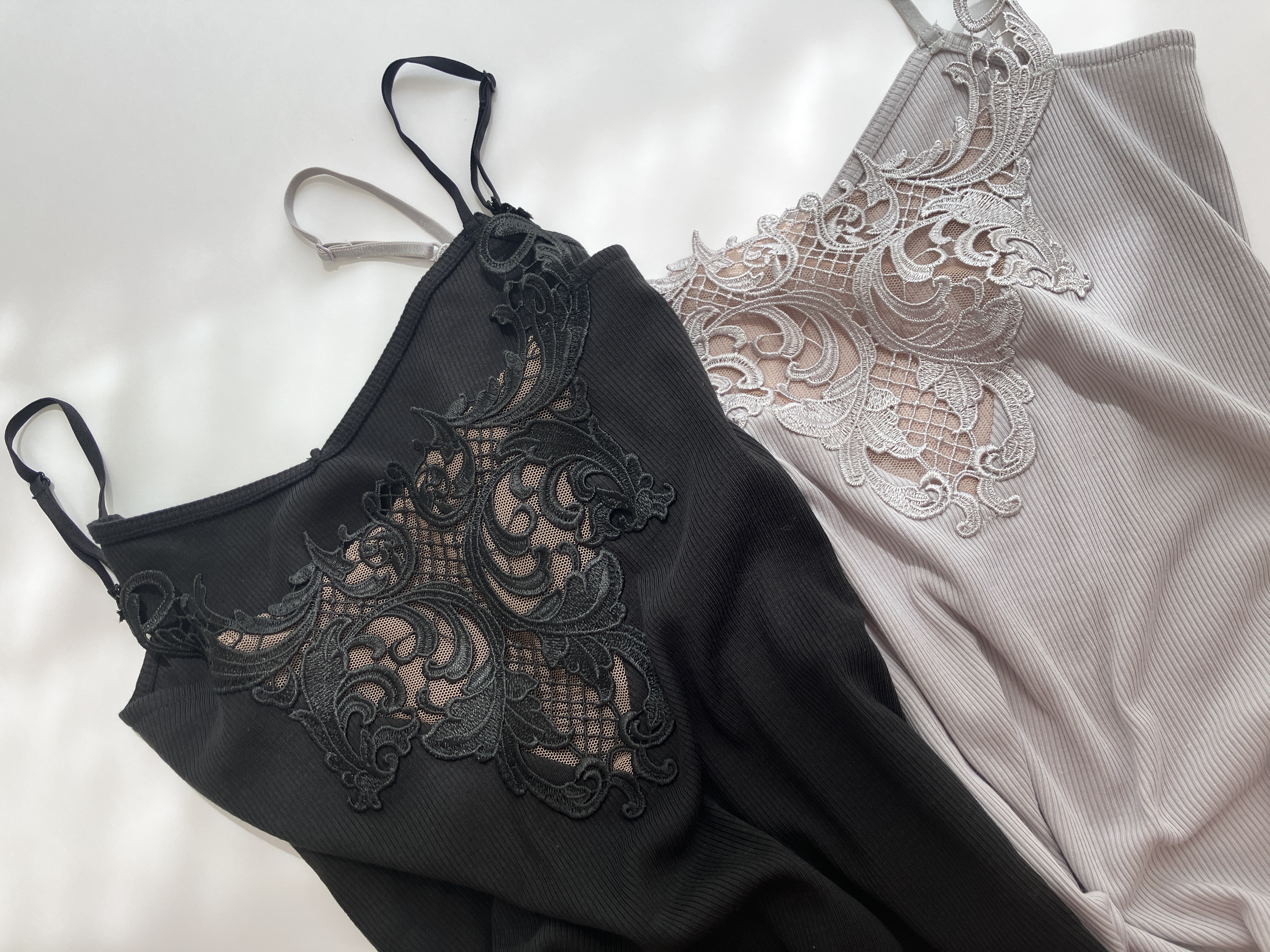 母の日のプレゼントにオススメなキャミソールをご紹介♪背中に大きく華やかなレースを施し、後ろ姿は大人っぽくエレガントな印象に!レースが映える華やかなブラックとシンプルで洗練された印象のグレー♪レースの下にはベージュのチュールが付いているのでお肌も綺麗に見えます!綿35%の綿混素材でシーズン問わず使いやすいのも嬉しいポイント♪使いやすさと年齢を選ばないデザインなのでギフトにもぴったりです!【¥3,920(税込) color BL/GY size M/L】