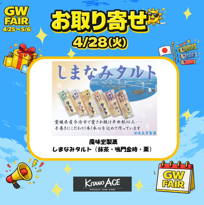 風味堂製菓しまなみタルト(抹茶あん・鳴門金時あん・栗あん)が入荷します!