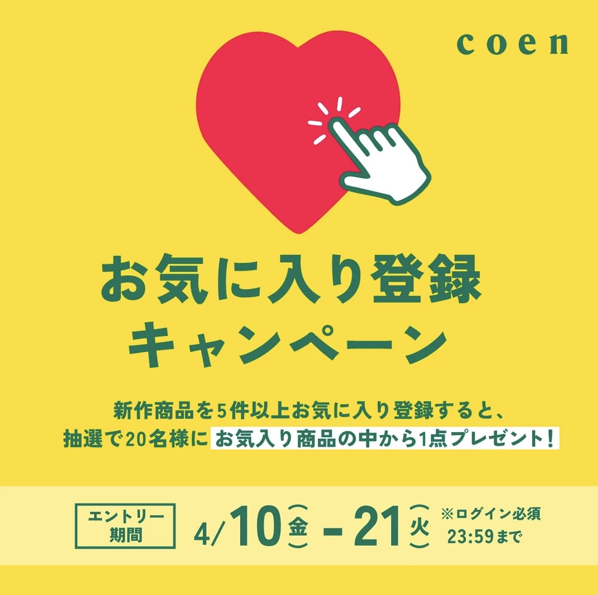 期間中に新作をお気に入り5件以上登録いただくと、抽選で20名様に お気に入りの中から1点をプレゼント!