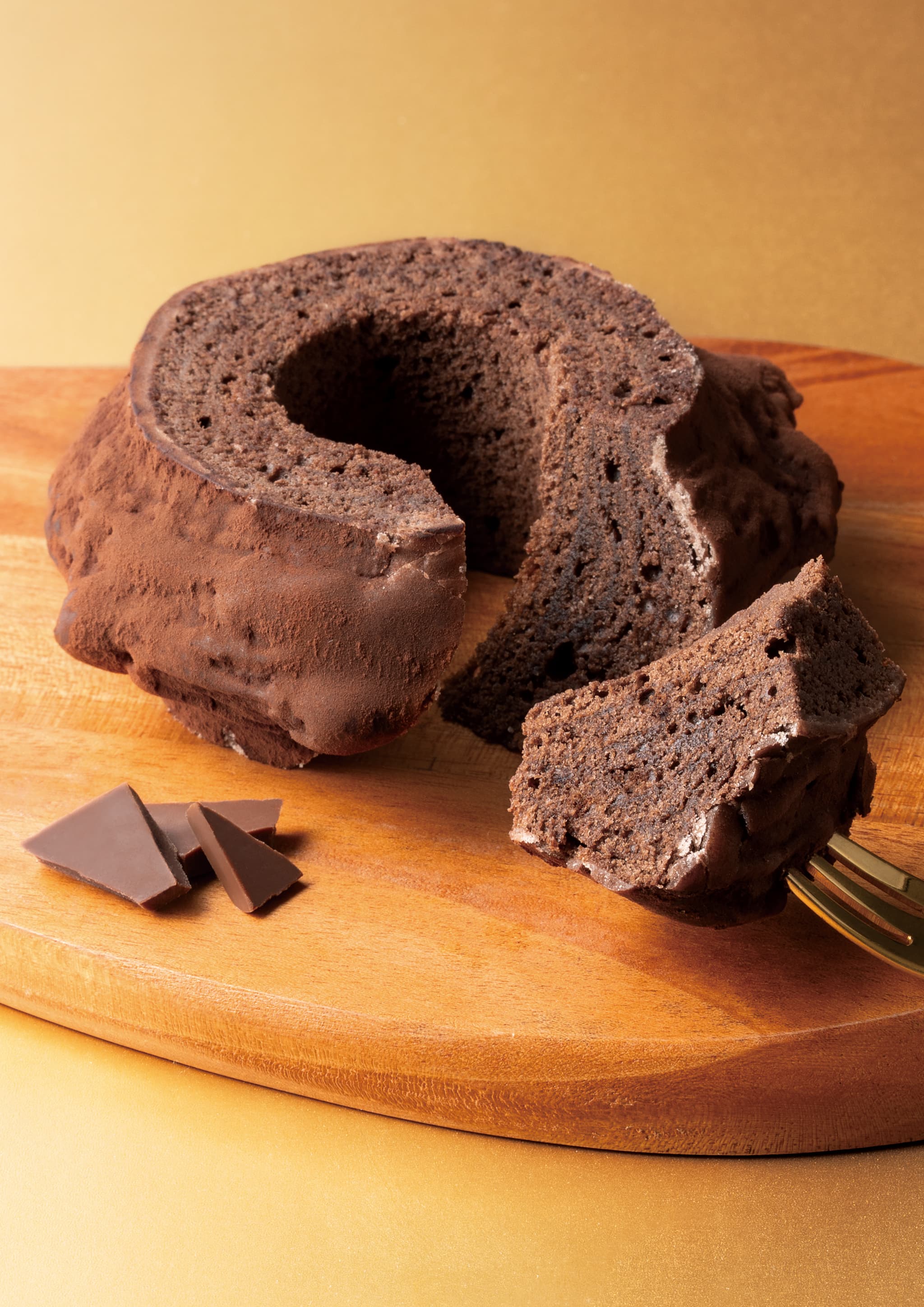 チョコレートを練りこみ焼き上げたバームクーヘンにシュガーコーティングを重ね、仕上げにココアパウダーをまぶしました。アクセントにほんのり洋酒を効かせることで奥行きのある味わいに仕上げています。