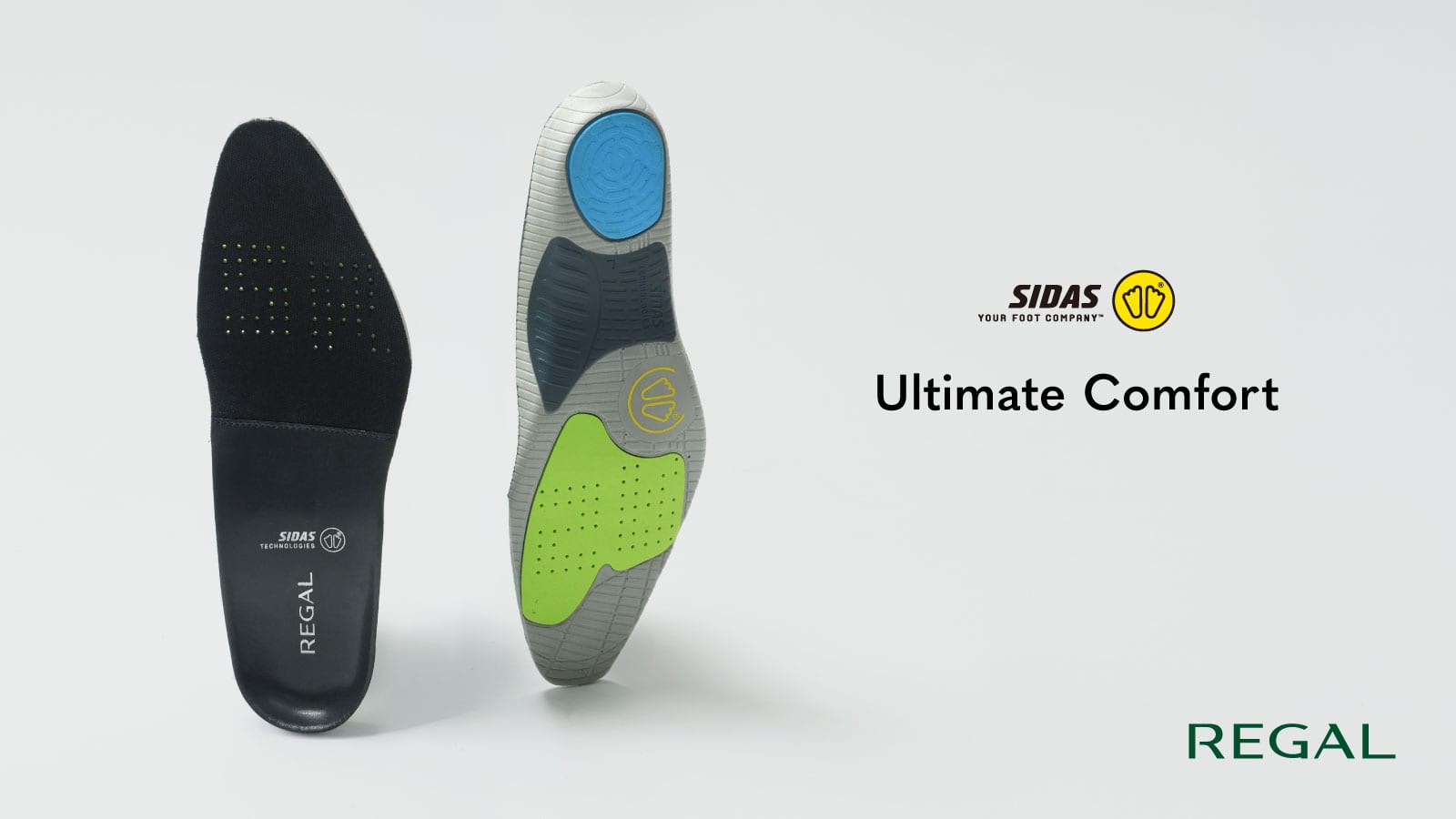SIDAS社の技術と、REGALの意匠が調和。高い衝撃吸収性能を持つ「マックスプロテクト・ラン」をベースに、ドレスシューズの端正な佇まいに合わせてデザインした、REGALオリジナルのインソールです。