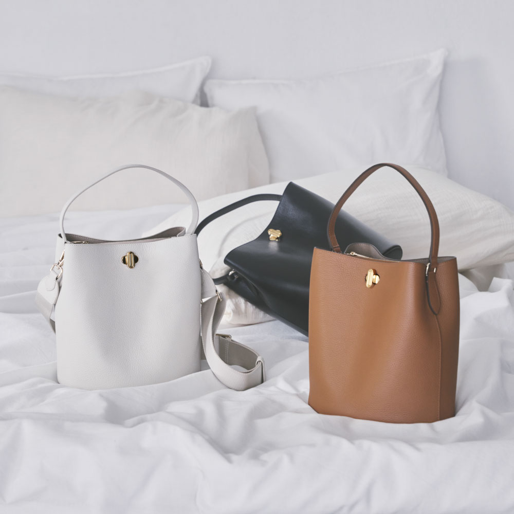 ころんとした立体的なフォルムが愛らしい、フェミニンなデザインのバケットバッグ。口が大きく開いて荷物の出し入れもスムーズ。普段のお出かけにちょうどいいミドルサイズに仕上げました。