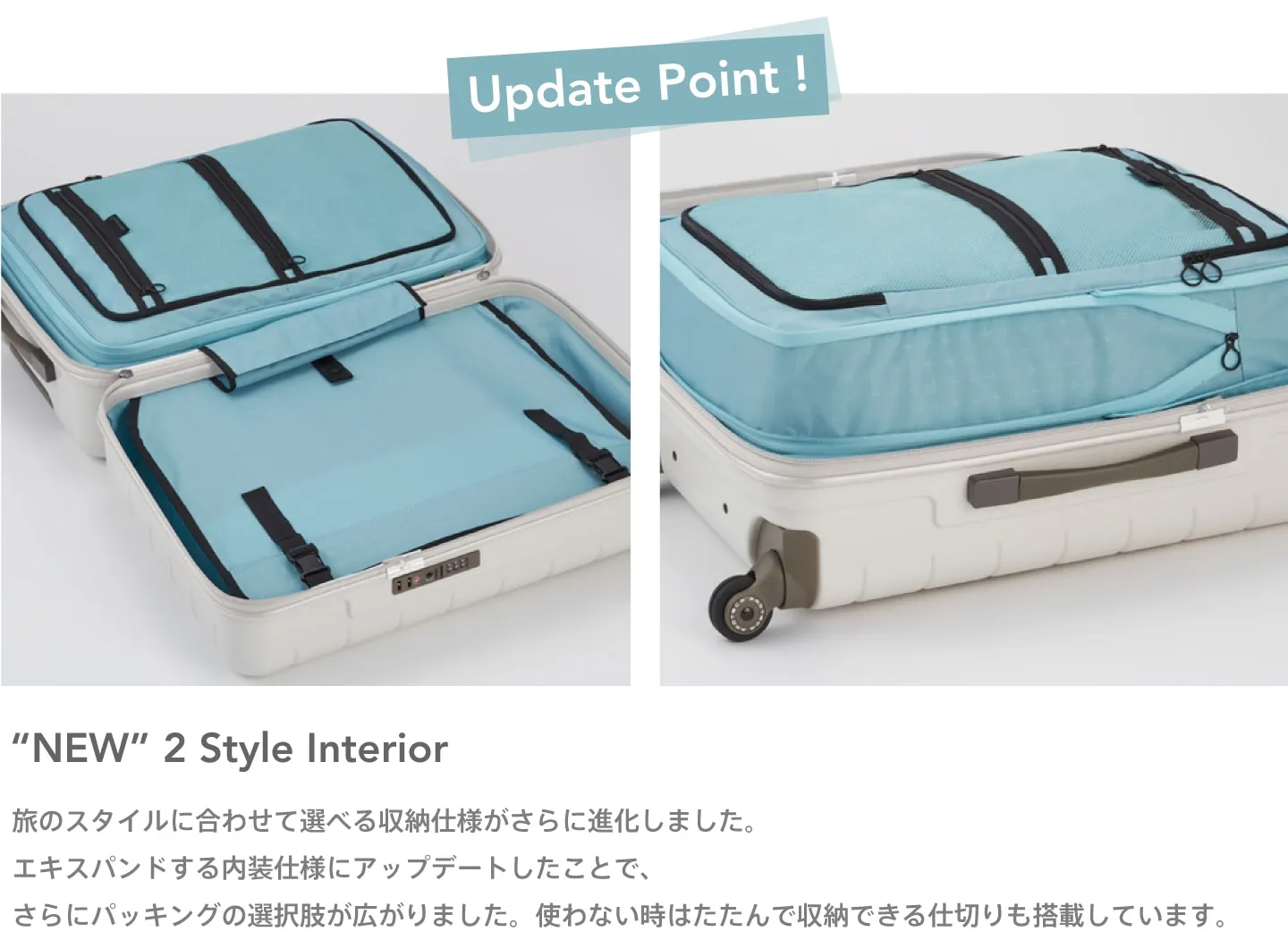 通常のスーツケースのように両面に荷物を分けて収納したり、片側を拡張させて集約させたり、スタイルに合わせて収納方法を選ぶことが可能。
